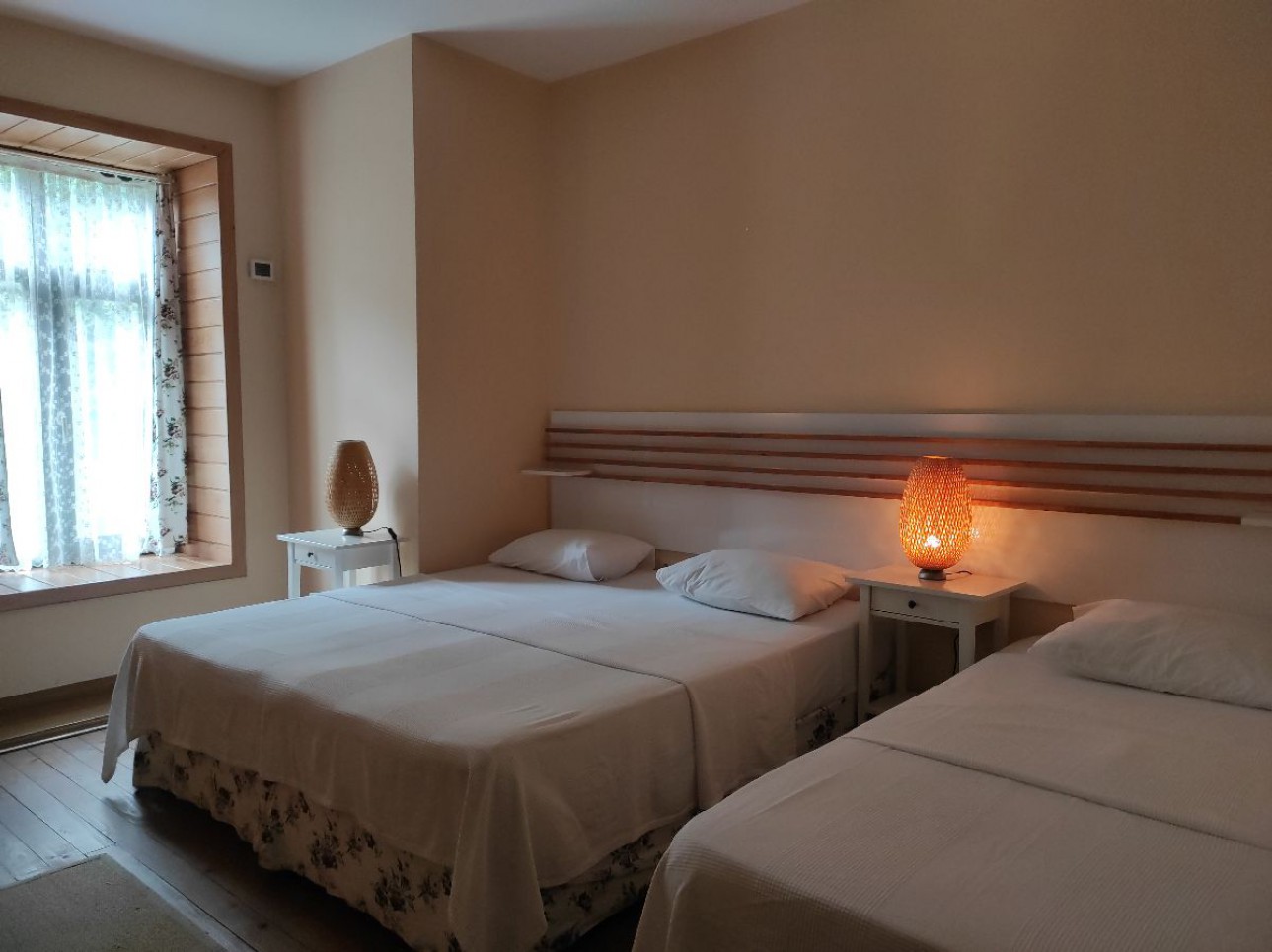 Manzralı Triple Odalarımızda bir çift kişilik (Double) bir adet de tek kişilik (single) yatak mevcuttur. İstenilmesi durumunda double yatak iki single yatağa dönüştürülebilir. Ek yatak olanağı mevcuttur istenilmesi durumunda rezervasyon aşamasında bildirmeyi unutmayınız.